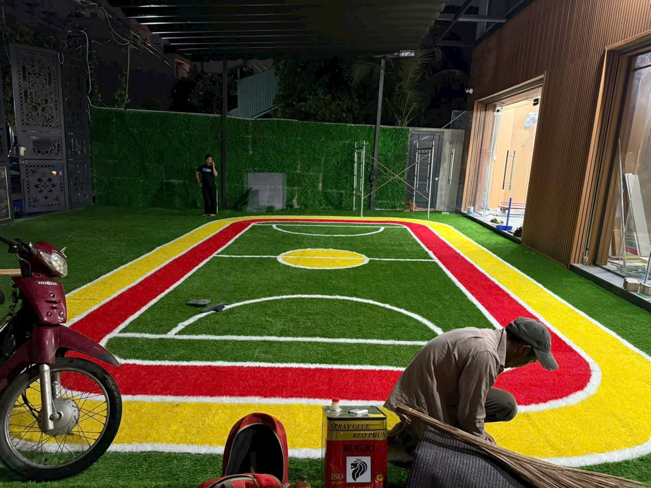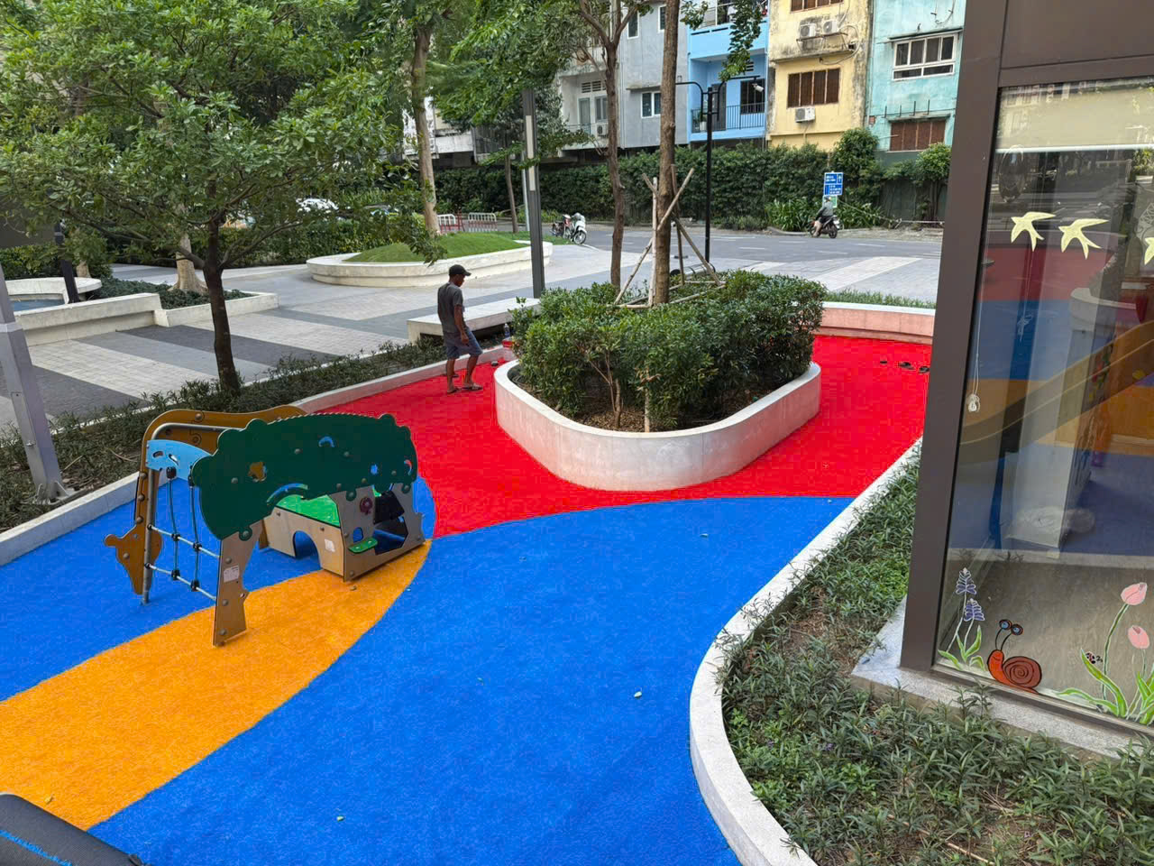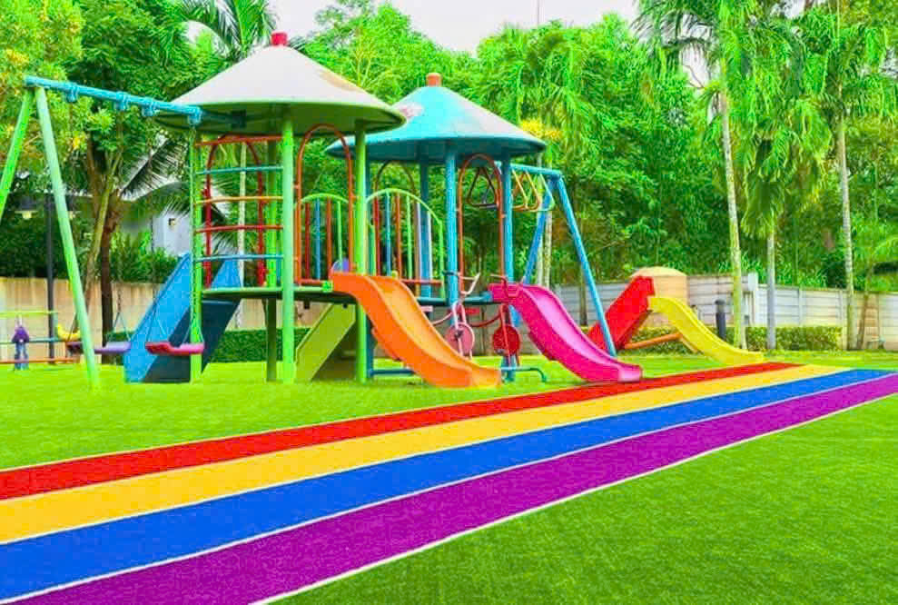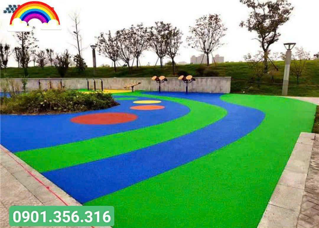 ✅ Trang trí sân chơi sinh động: Phối hợp cỏ màu đỏ, vàng, xanh dương tạo thành các hình khối, ô nhảy, đường chạy vui nhộn.